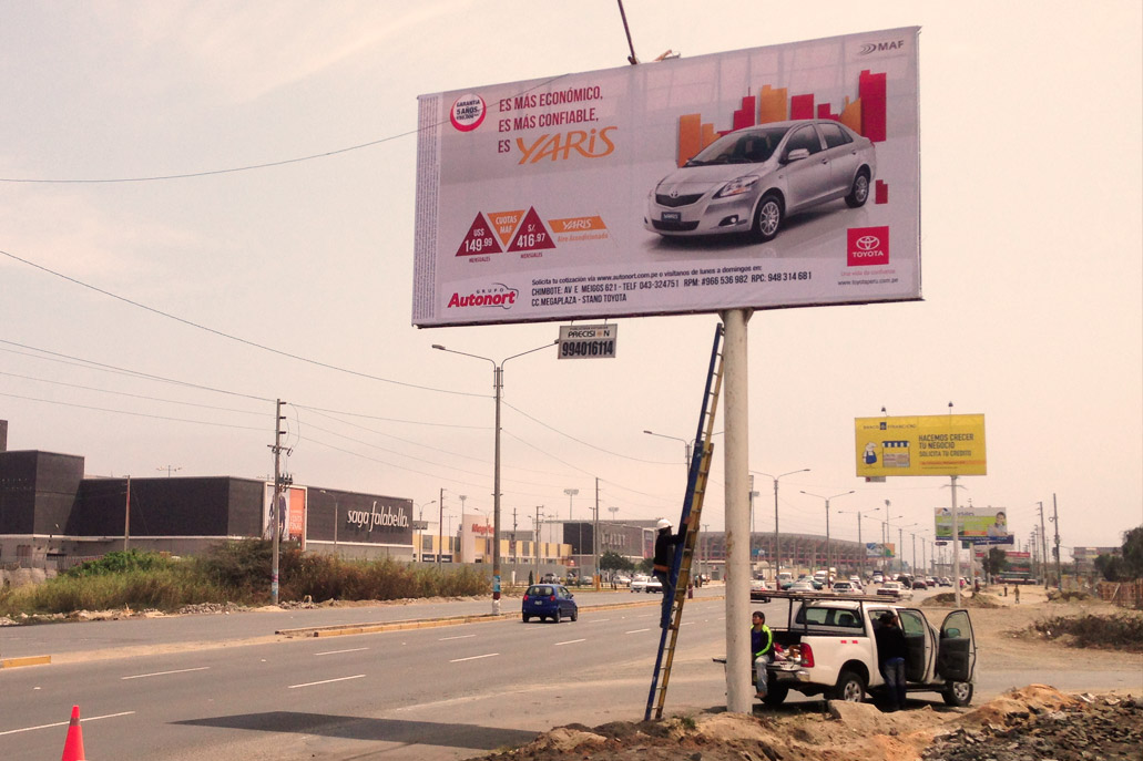 ° Producción de lona publicitaria e instalación en panel unipolar exterior publicitario con campaña Toyota para Chimbote frente a Mega Plaza.